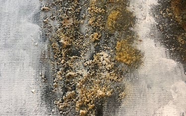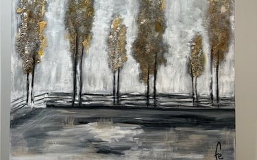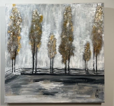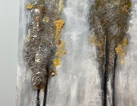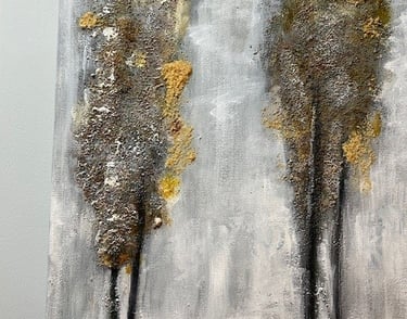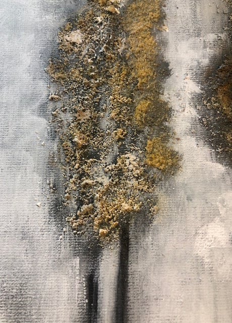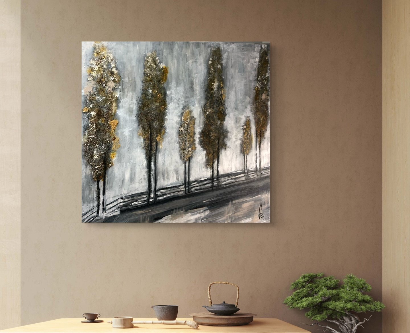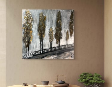 Este cuadro forma parte de mi casa. Las texturas doradas del lienzo, se abren paso entre tonos arbóreos apagados, culminado con un fondo que adivina la llegada de la noche, alimentada por un gran faro lunar.