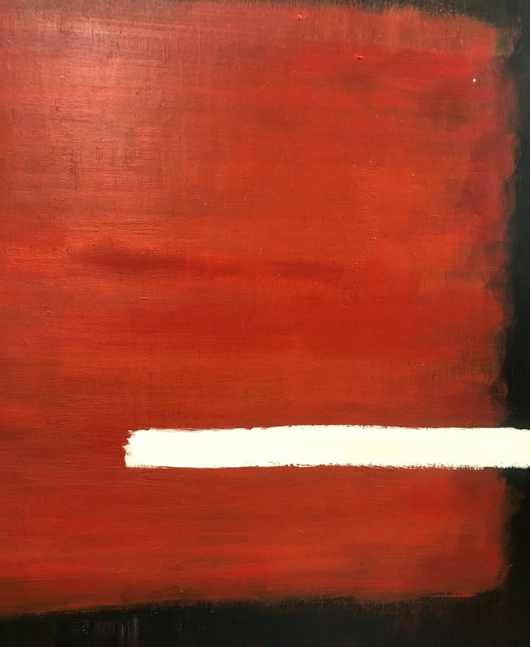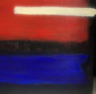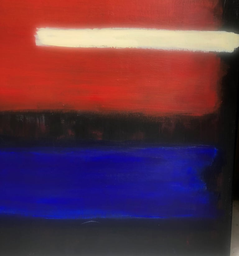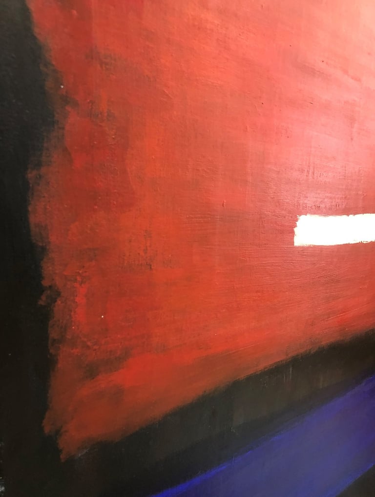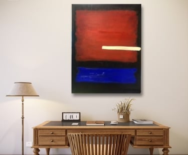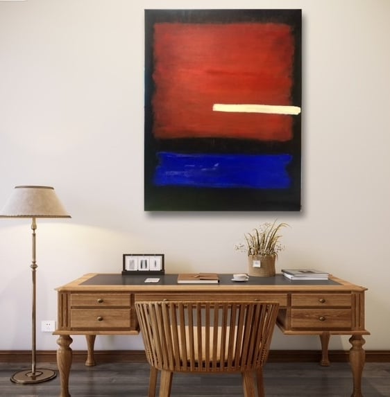 Este obra está inspirada en un pintor estadounidense Marc Rothko. Me gusta su sencillez y combinación de colores. Un sobrio fondo negro animado con un carmín y azul cobalto. Ideal para decorar estancias donde la simplicidad y elegancia son las protagonistas.