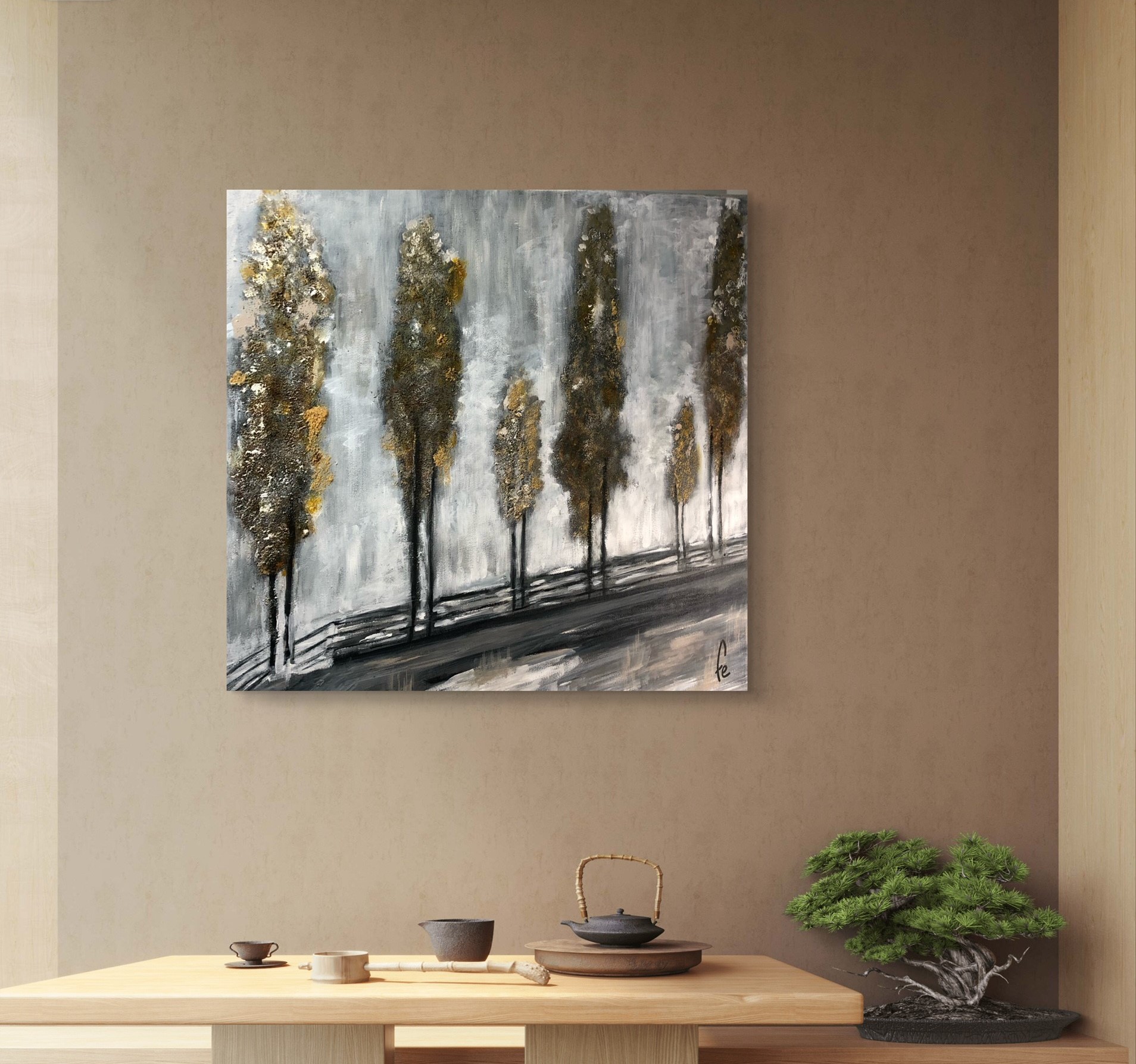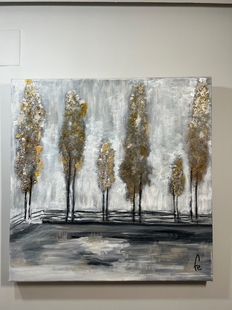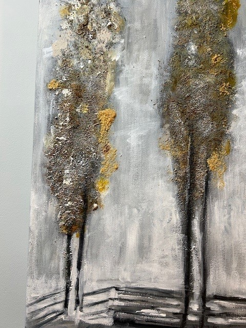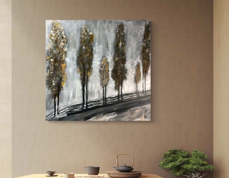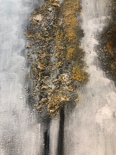 Este cuadro forma parte de mi casa. Las texturas doradas del lienzo, se abren paso entre tonos arbóreos apagados, culminado con un fondo que adivina la llegada de la noche, alimentada por un gran faro lunar.