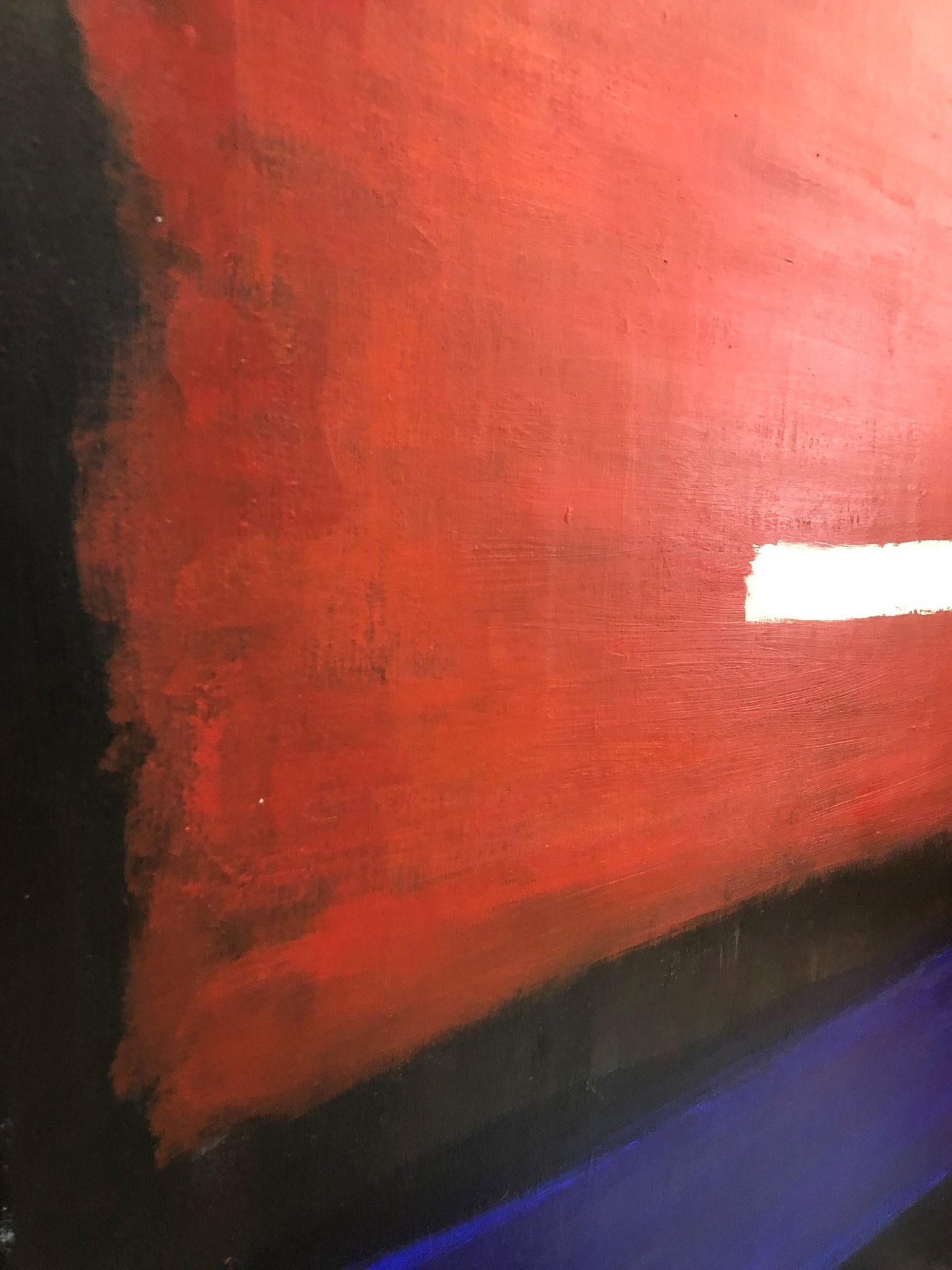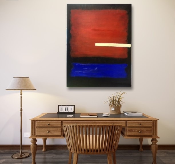 Este obra está inspirada en un pintor estadounidense Marc Rothko. Me gusta su sencillez y combinación de colores. Un sobrio fondo negro animado con un carmín y azul cobalto. Ideal para decorar estancias donde la simplicidad y elegancia son las protagonistas.